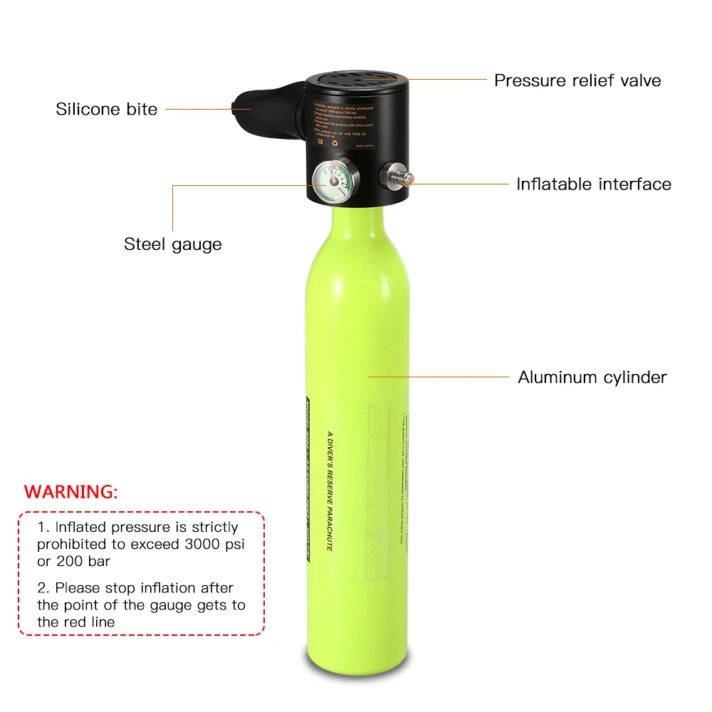 Позволяет оставаться под водой не глубже 10 метров в течение 5-10 минут. 3 способа для быстрого надувания: ручной надувной насос высокого давления, электрический насос или заправкаБольшим цилиндром. Отлично подходит для дайвинга, развлечений, практики или тренировок.