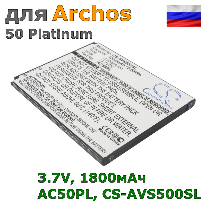 Подходит для: Archos 50 Platinum, 50 Helium 4G, 50Подходит для замены аккумуляторов с номерами (partNo): AC50PL, а также CS-AVS500SL