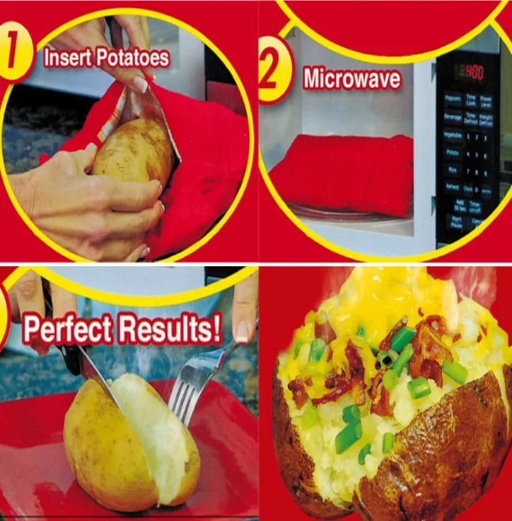 Всем нравится вкусная запеченная картошка, но для запекания в духовке требуется не менее 45 минут. Когда вы ставите их в микроволновую печь для удобства, они кашистые, сухие и совершенно не привлекательные. Вы можете сделать идеальный печь запеченный картофель в микроволновой печи Это так быстро, как четыре минуты, просто и удобно. Способ состоит в том, чтобы положить картофель в пакеты для картошки и поместить их в микроволновую печь. Всего за четыре минуты, горячий запеченный картофель На вкус как нежная кожа, мягкая внутри. Секретом является уникальный дизайн изоляции, с правильным количеством влаги, чтобы создать паровой карман после приготовления картофеля. Не слишком влажный, не слишком сухой, чтобы обеспечить любой вкус нежного и пушистого запеченного картофеля! Популярными способами приготовления пищи являются картофель со свитаной и зубеком, бекон и сыр, вкусный картофель Чили, и даже брокколи и сыр cheddar. Добавьте сахар и Зефир в сладкий картофель или ямс! Пакет для картофеля вмещает до четырех полноразмерных картофелей, и вся семья может наслаждаться вкусной едой за четыре минуты! Вы также можете добавить маленький красный картофель, Охлажденный твердый хлеб или кукурузу, вкусный картофельный салат! Сэкономит ваше время. Машинная стирка и многоразовое использование. Перестаньте терять время на выпечку картофеля Очень легко работать в духовке