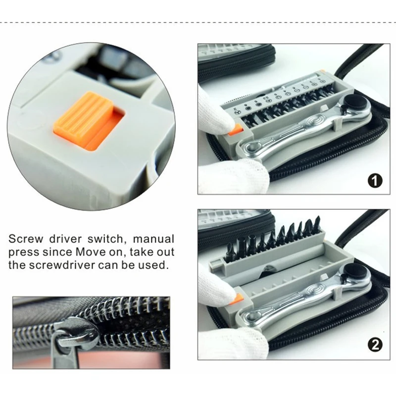 1. Этот продукт использует динамическую трещотку, легко завинчивать винт, маленький и не занимает место, все инструменты находятся в маленькой коробке.
