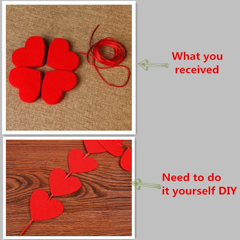 [Product] LOVE garland LOVE size: 7.7cmx6cm,rope length about 3m,1pcs/lot(16 hearts) [Material] Non-woven color: red [Style] romantic wedding, home decor [Contains] 1 / order, 16 love heart,1 rope [Weight] 20 g [Occasion] weddings, birthdays, business, anniversary celebrations, party Notice: 1.Due to the light and screen difference, the item's color may be slightly different from the pictures. 2.Please allow 1mm differences due to manual measurement. If you want more fantastic wedding/party/home decorations,welcome to our store.