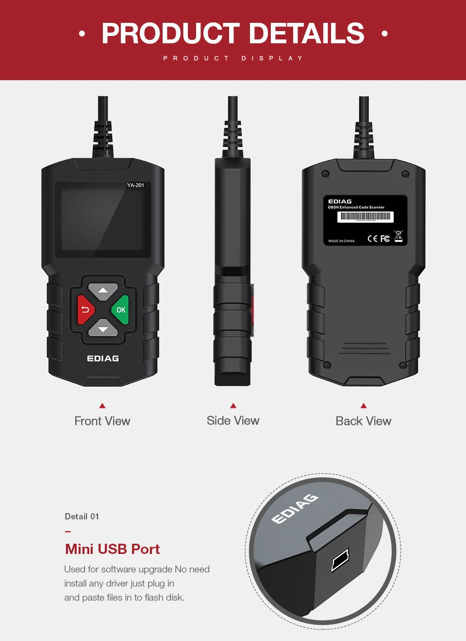 Топ 8 причин для выбора Ediag YA201:1.Бесплатное обновление срока службы: Просто положите в USB и вставьте файлы в флэш-диск2.Мульти-Язык:Английский, французский, русский, испанский, немецкий, итальянский, португальский, японский, китайский