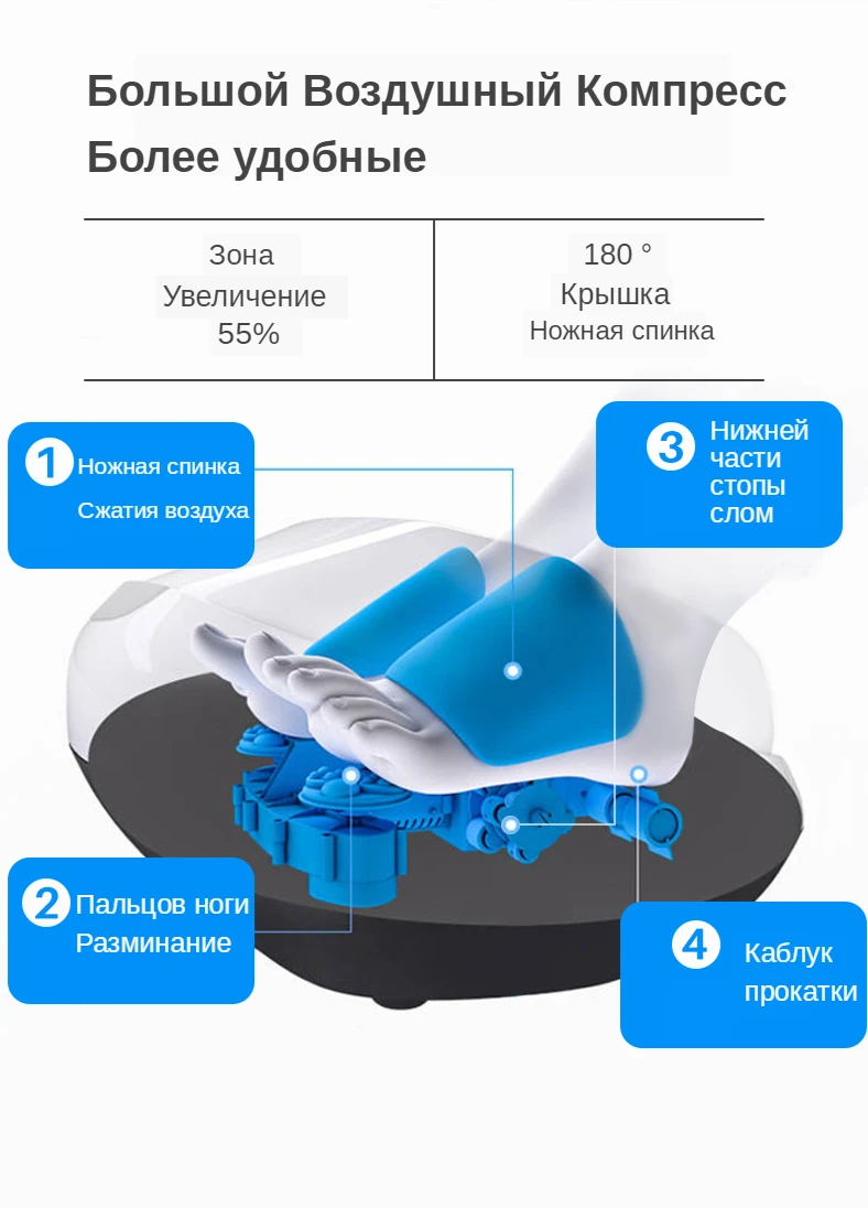 1,360 ° сжатия воздуха 2. Шесть массажных 3. Три мощности 4. Нагрева