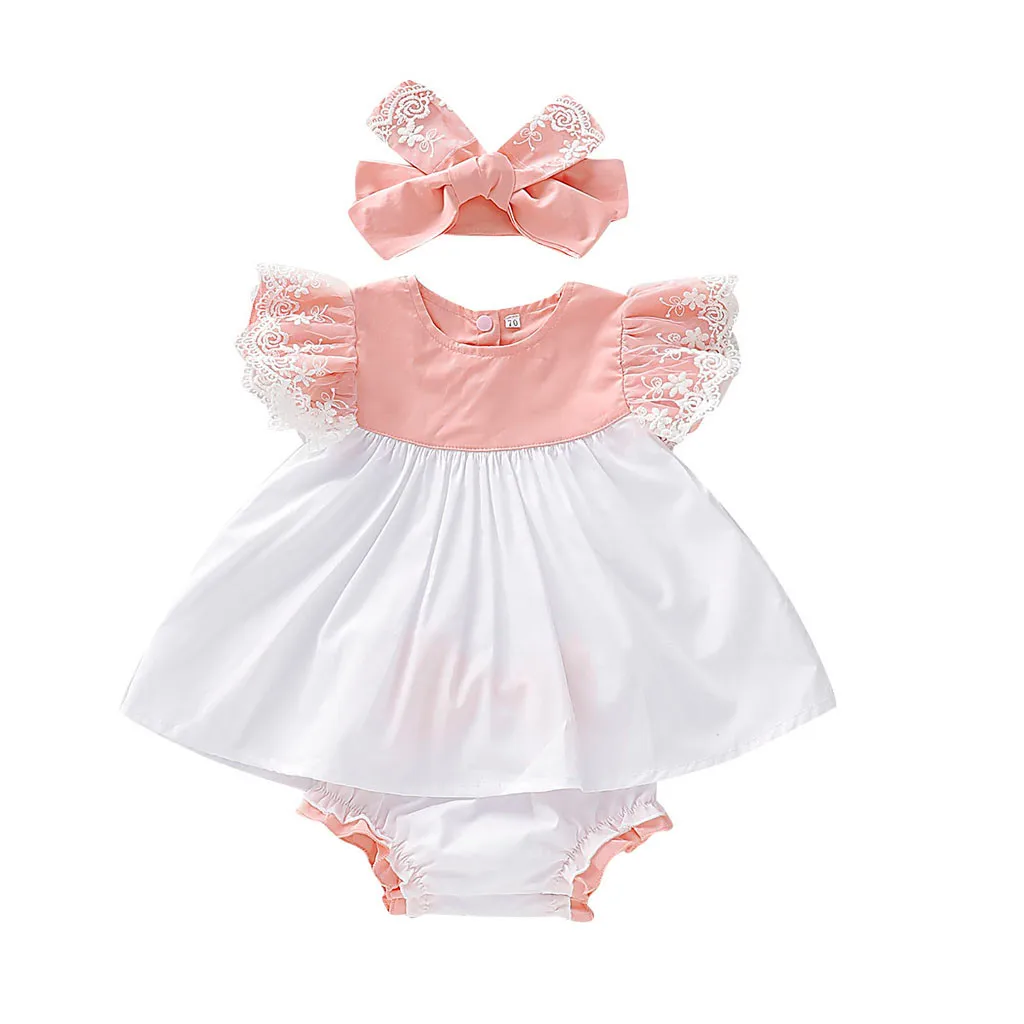 Леггинсы с кружевными бантиками комплект одежды с платьем детский, для новорожденных, для девочек, детская повязка на голову милое Рубашка с короткими рукавами платье для дня рождения Одежда для маленьких девочек розовый Платья для маленьких девочек
