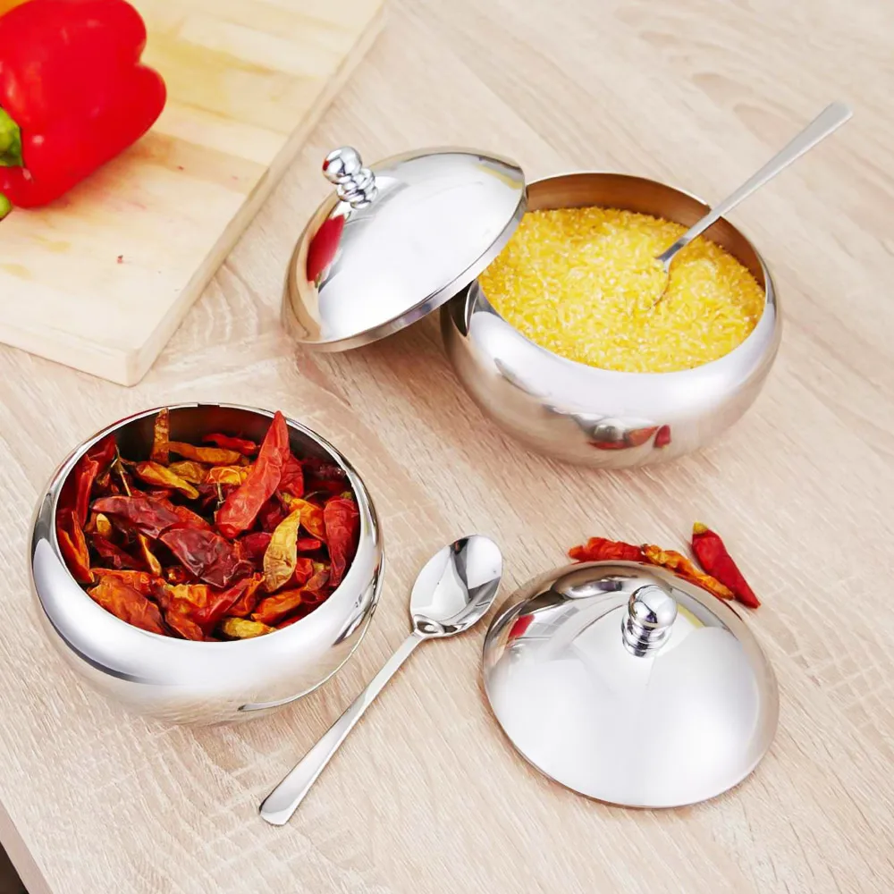 Этот горшок для приправ из нержавеющей стали поставляется с сервировочной ложкой и крышкой, которая отлично подходит для вашей кухни.