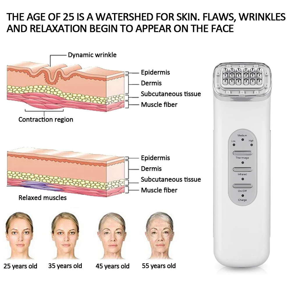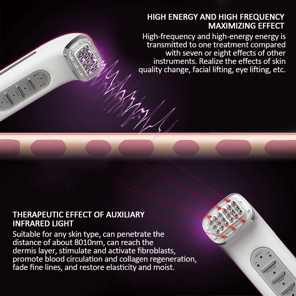 Особенности 1. Инновационный multi-точек РФ Лечение зонды, выходная мощность более RF энергии, эффективно омоложения кожи, удаление морщин и затяните ослабленные кожи, большой пробник, подогреваемый поверхность кожи. 2. Вспомогательный инфракрасный светильник, повышает терапевтическую эффективность. 3. Портативный и Перезаряжаемый, легко носить и использовать в любом месте и в любое время. 5. Индуктивный дизайн, зонды для лечения работают только при касании кожи, умном и энергосберегающем. 6. Низкие/Средние/высокие уровни для вариантов, подходящих для различных потребностей и типов кожи. 7. Интеллектуальная Сигнализация низкого напряжения, зарядка и полностью заряженные индикаторы. 8. Тепловая энергия пропитает кожу.