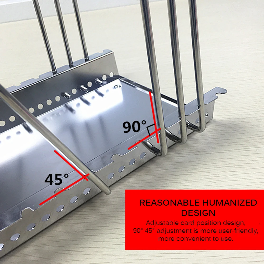 Стойку можно отрегулировать под углом наклона от 90 до 45 градусов, чтобы удовлетворить ваши потребности. Вы также можете отрегулировать расстояние между двумя стойками, изменив отверстие отсека в соответствии с различными размерами удерживающего элемента.