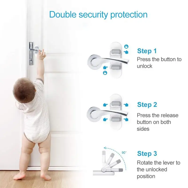 Модернизированная конструкция дверного уровня с двойным замком для детей, с двойной системой блокировки, которая удерживает детей или домашних животных от открытия дверей, сохраняя их в безопасном месте. Наш замок требует от взрослого нажатия на круглые кнопки и нажатия кнопок с обеих сторон замка, чтобы открыть. Большинство детей не могут открыть его независимо от того, насколько сильно они пробовали.