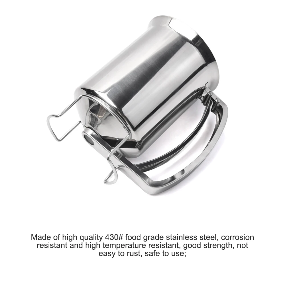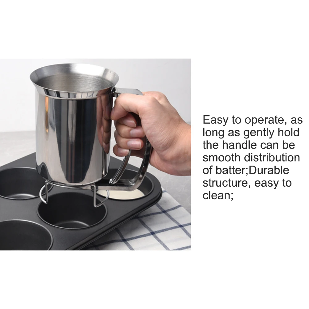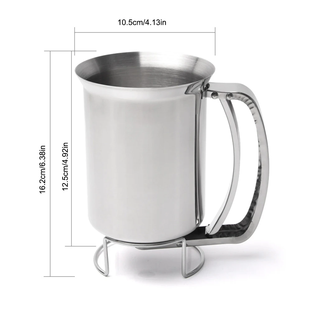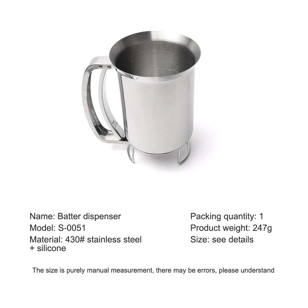 The pancake batter funnel is made of high quality 430# stainless steel, which is corrosion resistant, high temperature resistant, anti-rust, tough, hard and wear resistant. The pancake batter funnel is not only durable but also can be easily clean under water directly.