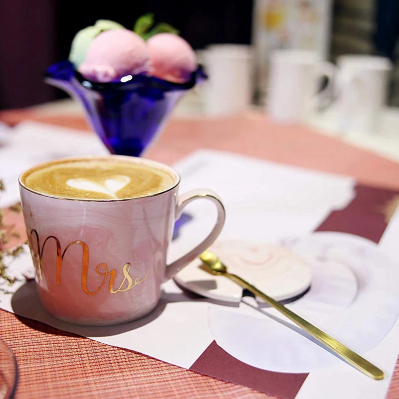 Mr Mrs Coffee Mugs Set Ceramic Marble 15Oz Cup With Lids And Spoon In Gift Box Pink |