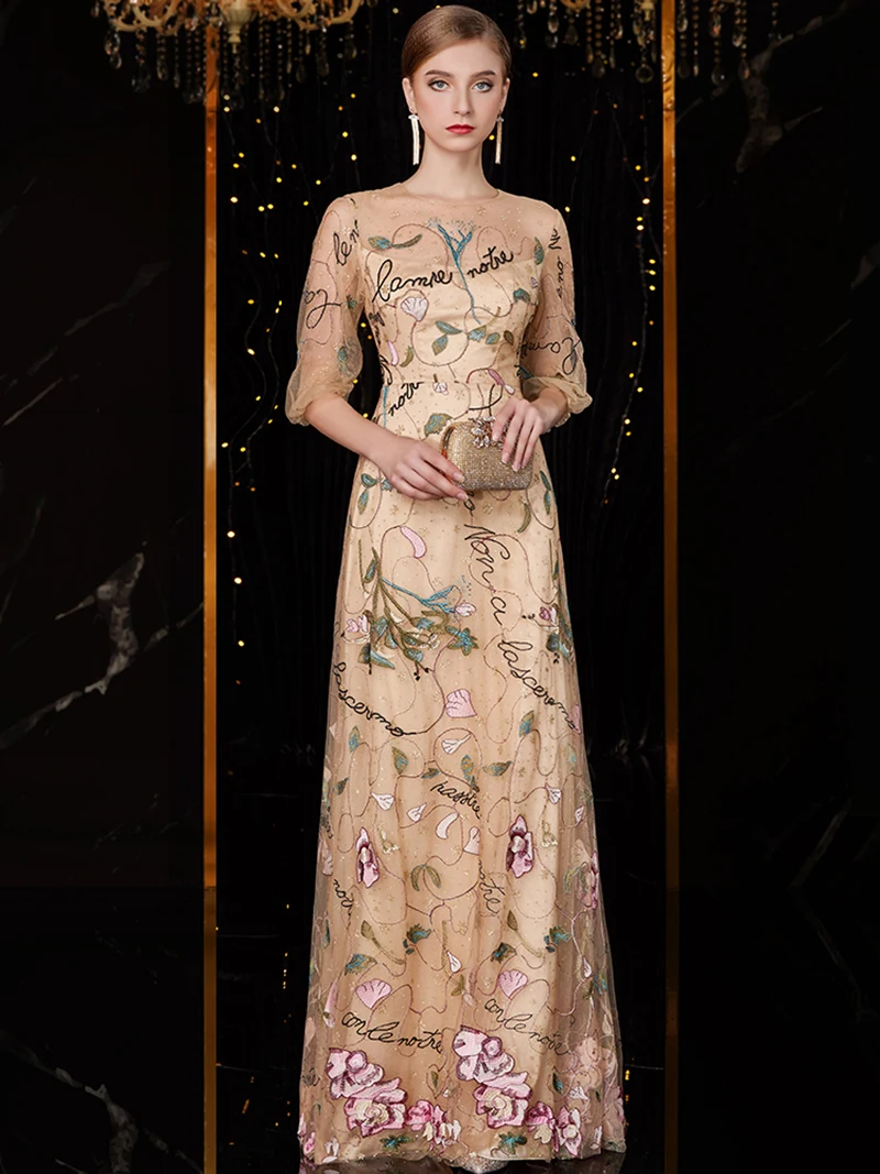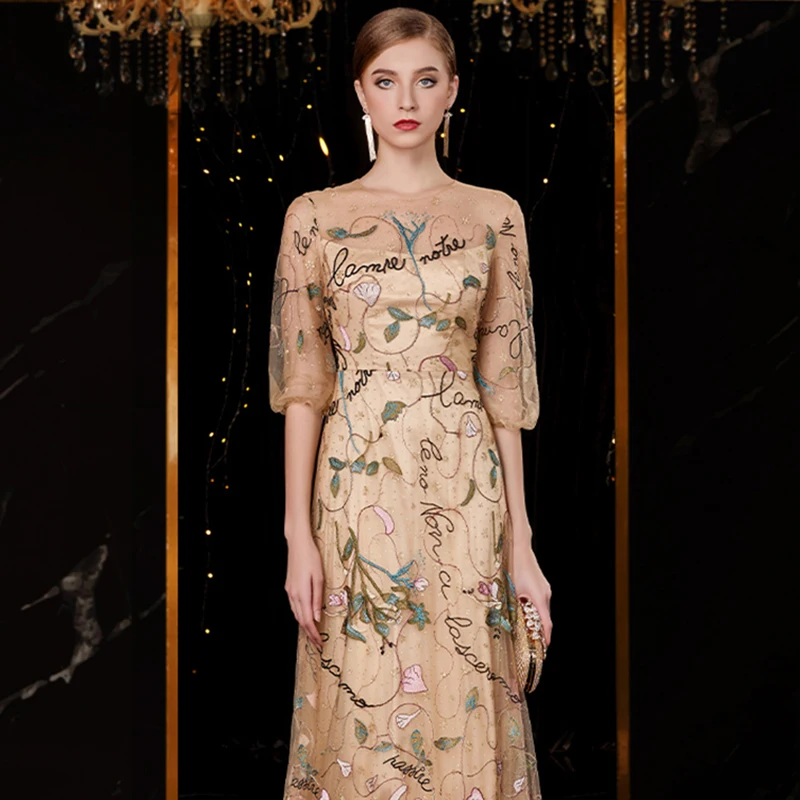 J1820 jancember ТРАПЕЦИЕВИДНОЕ вечернее платье с О-образным вырезом три четверти рукав Аппликации Кружева Золото для матери невесты платья вечернии платья