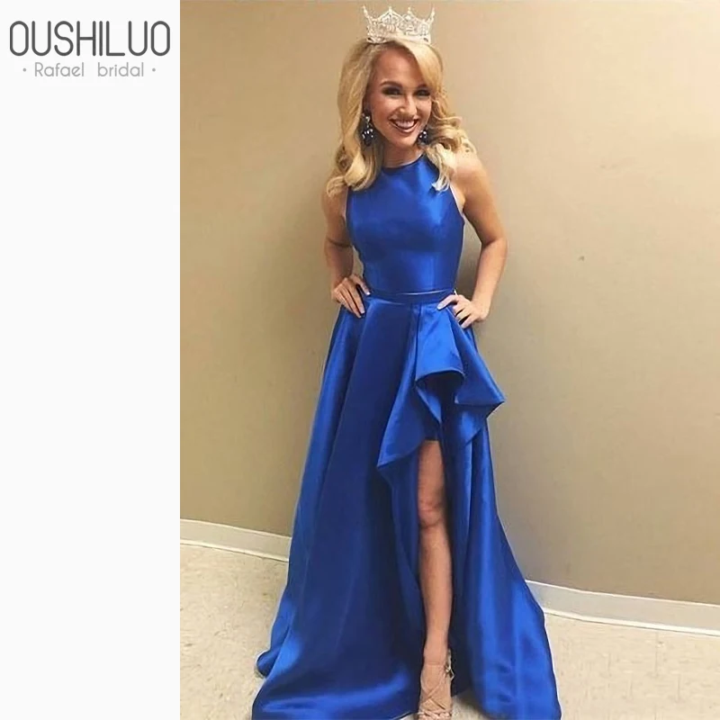 Женское платье из двух частей, ярко-синее платье для выпускного вечера, укороченный топ, элегантное платье для выпускного вечера с круглым вырезом и высоким разрезом, вечерние многоярусные платья с оборками