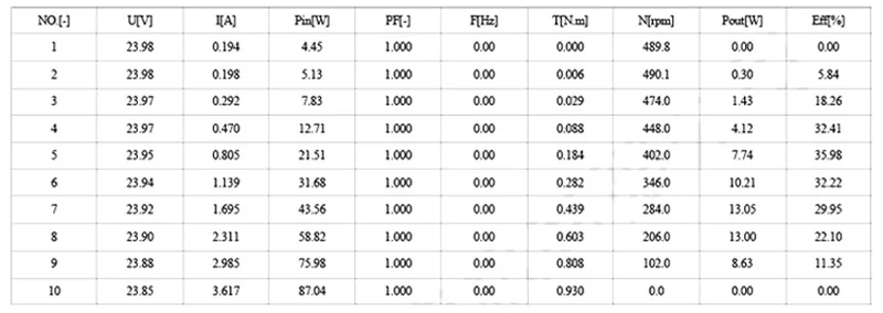 Ниже приведены тестовые данные постоянного тока 24 В со скоростью холостого хода 500 об/мин.