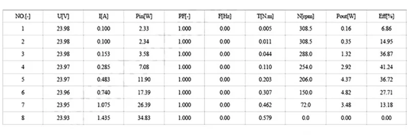 Ниже приведены тестовые данные постоянного тока 24 В со скоростью холостого хода 300 об/мин.
