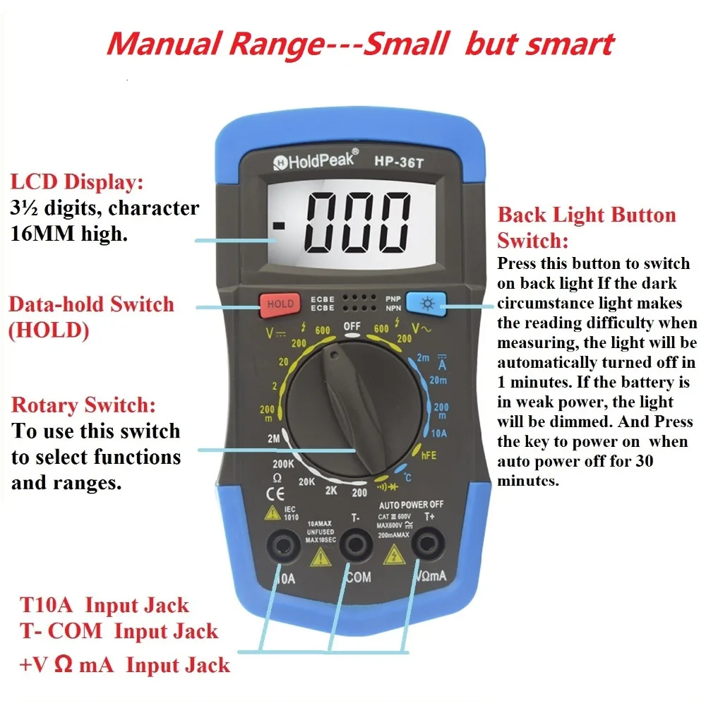 Цифровой тестер Holdpeak HP-36T, ручной диапазон, профессиональный мини-мультиметр, Инструмент Сопротивления напряжения постоянного тока и переменного тока