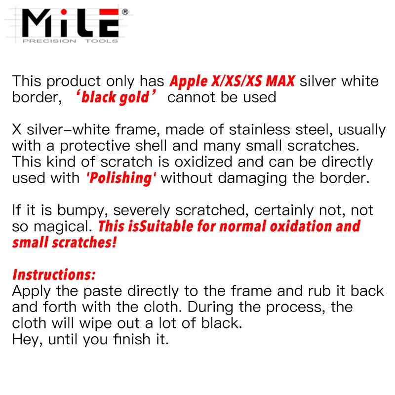 Полировальная паста для рамки сотового телефона удаление царапин для iphone X Xs maXЗнать перед покупкой: Можно полировать только Серебристые моделиИнформация о продукте сумки: Изысканная упаковочная сумка X1 (как показано на рисунке, обратите внимание, что цвет отправляется случайным образом)Полировальная паста X1 (Вес брутто 10 грамм)Ткань для протирки X1 (случайный цвет)