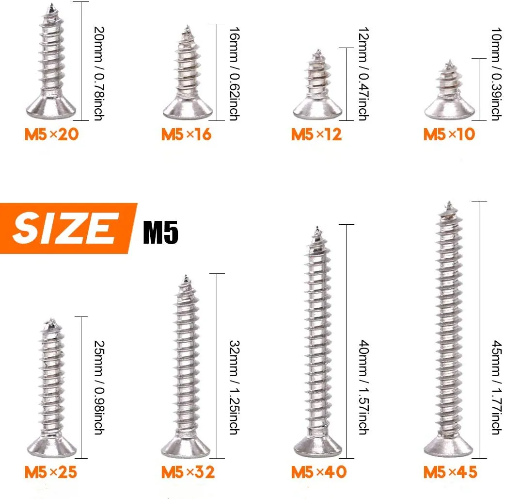 🔩〖Передовой материал 〗 -- изготовлен из высококачественной нержавеющей стали 304, устойчив к коррозии и ржавчине во влажной среде, который можно хранить в течение длительного времени, обладает высокой прочностью, не деформируется, твердость нержавеющей стали 304 в два раза выше, чем у меди. 🔩〖Ценность для денег -- какой посылка в прочной прозрачной коробке достаточно, чтобы вместить все предметы в случае потери, между тем, различные размеры могут удовлетворить все ваши личные потребности. 🔩〖Широкое применение -- широко используется в оборудовании, дверях и окнах, мебели, офисе и т. д., саморезы заострены, его можно использовать на закрепляемом материале с помощью собственной резьбы, твердый корпус будет прижат к соответствующей резьбе, чтобы они плотно совпадали друг с другом. 🔩〖 Стандартная перекрестная углубление-стандартная перекрестная углубление, даже усилие не скользит, 45 градусов не может снять винт, он более удобен в использовании, поверхность гладкая, глубокий туннель с поперечным пазом, легко затягивается. 🔩〖 Беззаботная покупка -- мы гарантированно решаем проблему качества нашей продукции. Если вы недовольны нашим товаром по какой-либо причине, пожалуйста, свяжитесь с нами, мы решим проблему как можно скорее, и я отвечу вам в течение 24 часов, Характеристики: Материал: нержавеющая сталь 304 Размеры винтов: 20 мм, 16 мм, 12 мм, 10 мм, 25 мм, 32 мм, 40 мм, 45 мм. Тип головки: плоская головка Основные характеристики: -- Изготовлен из нержавеющей стали 304, устойчив к коррозии и ржавчине во влажной среде, можно хранить в течение длительного времени. -Широко используется в оборудовании, цифровых устройствах, дверях и окнах, мебели, офисе и т. д. Посылка входит: 12 шт. .................. 10 мм (M5 * 10) 10 шт. ...................... 12 мм (M5 * 12) 8 шт. ...................... 16 мм (M5 * 16) 6 шт. ........................... 20 мм (M5 * 20) 5 шт. ........................... 25 мм (M5 * 25) 4 шт. ................................ 32 мм (M5 * 32) 4 шт. ........................ 40 мм (M5 * 40) 4 шт. ........................ 45 мм (M5 * 45) Предупреждение: товар не подходит для детей, храните его подальше от детей.