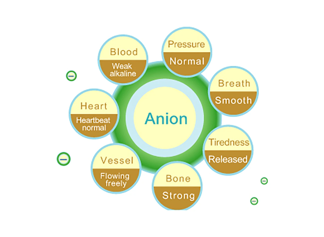 Отрицательные ионы и катионы вместе образуют заряд. В общем, существует много катионов в загрязненном воздухе, и анионы в основном распределяются в бесплатных долинах лесов, пляжей и других мест. Человек с хроническим недугом, который живет в катионически богатой области, ускорит развитие болезни. Если он подвержен воздействию анионов, он активирует клетки, повышает сопротивление и избавляет от хронических заболеваний.