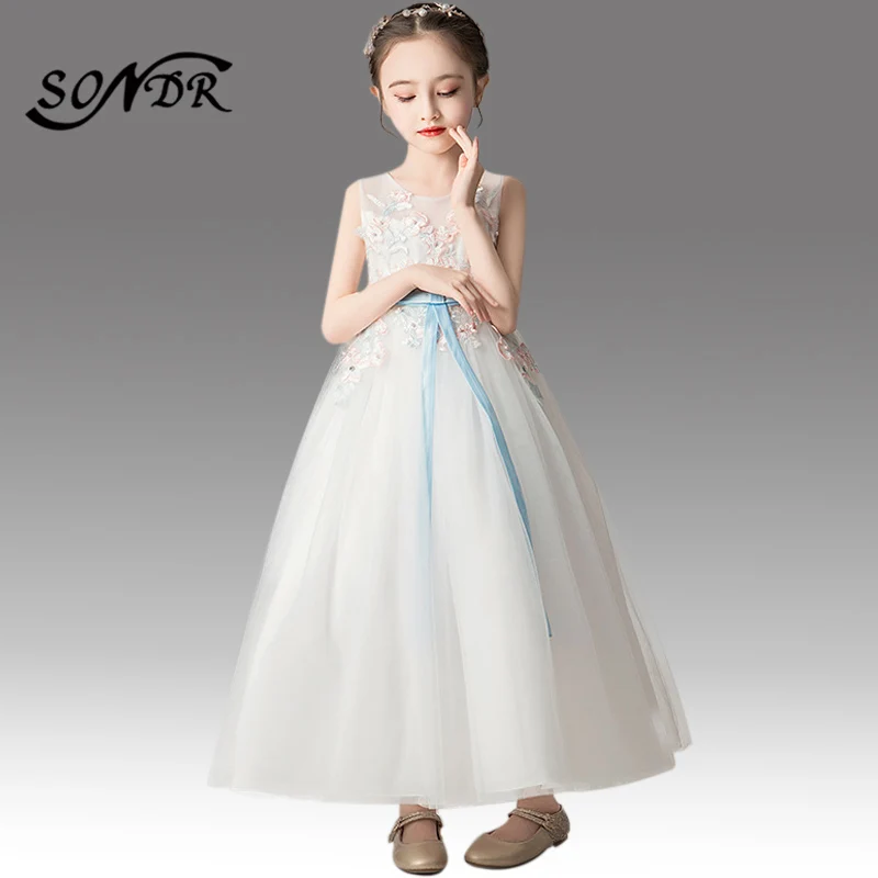 Торжественное платье для причастия; HT003; Платье с цветочной аппликацией для девочек; Детское праздничное платье без рукавов с круглым вырезом и бантом
