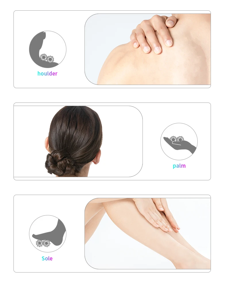 3. Торчащих краев на поверхности предназначены для массажа, и ее маленький размер и светильник вес подходят для массажа рук, рук, плеч и шеи. Край также стимулирует акупунктурные точки на теле, что помогает увеличить кровообращение и снять усталость.
