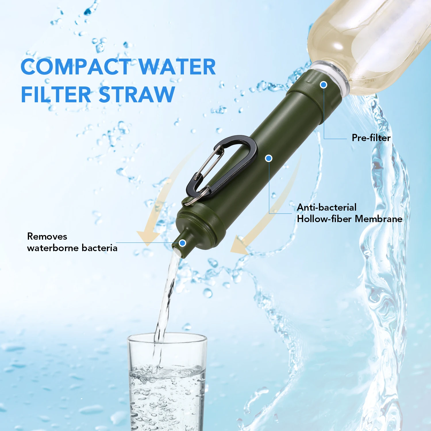 Этот фильтр для воды соломинка может эффективно удалить бактерии в воде, чтобы обеспечить чистую, безопасную воду. Его многофункциональный дизайн с сигнальным зеркалом, свистком, компасом делает фильтр для воды соломинкой идеальным оборудованием для выживания на открытом воздухе в чрезвычайных ситуациях, кемпинга, походов, альпинизма и т. д.