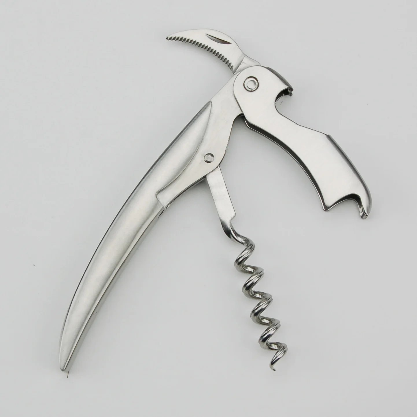 1) результат поверхности: шлифовка 2) Материал: 2cr13,430 4) штопор: электролиз, рифленый 4) головка: однорычажный 5) лезвие: зубчатое Размеры: 12 × 2,5 × 1,3 см, 110 г