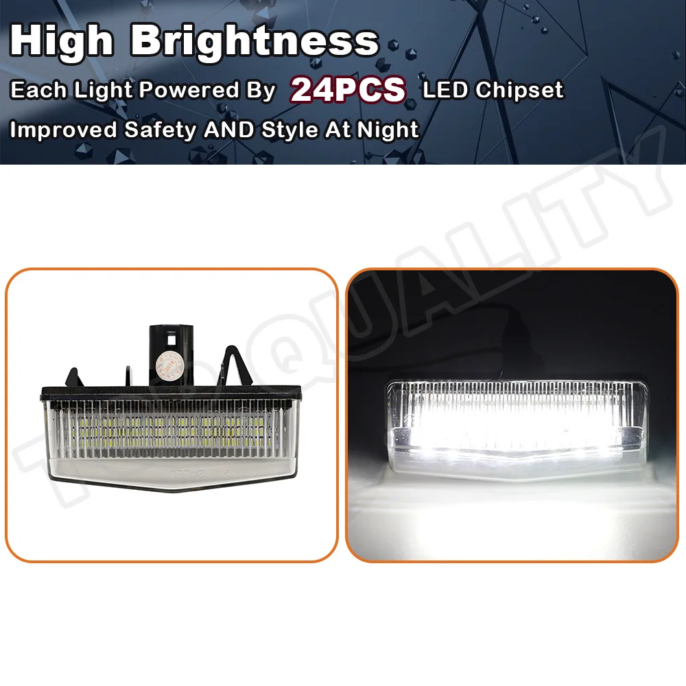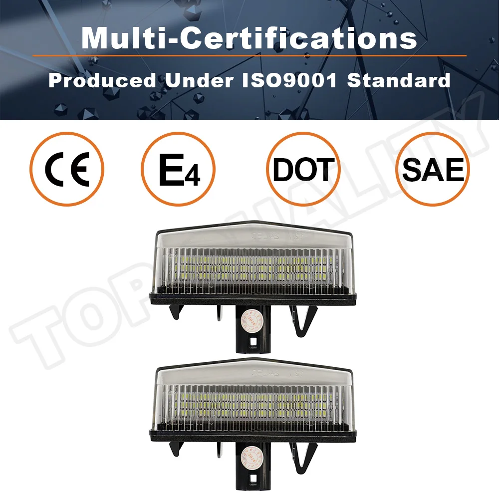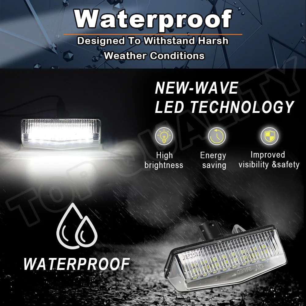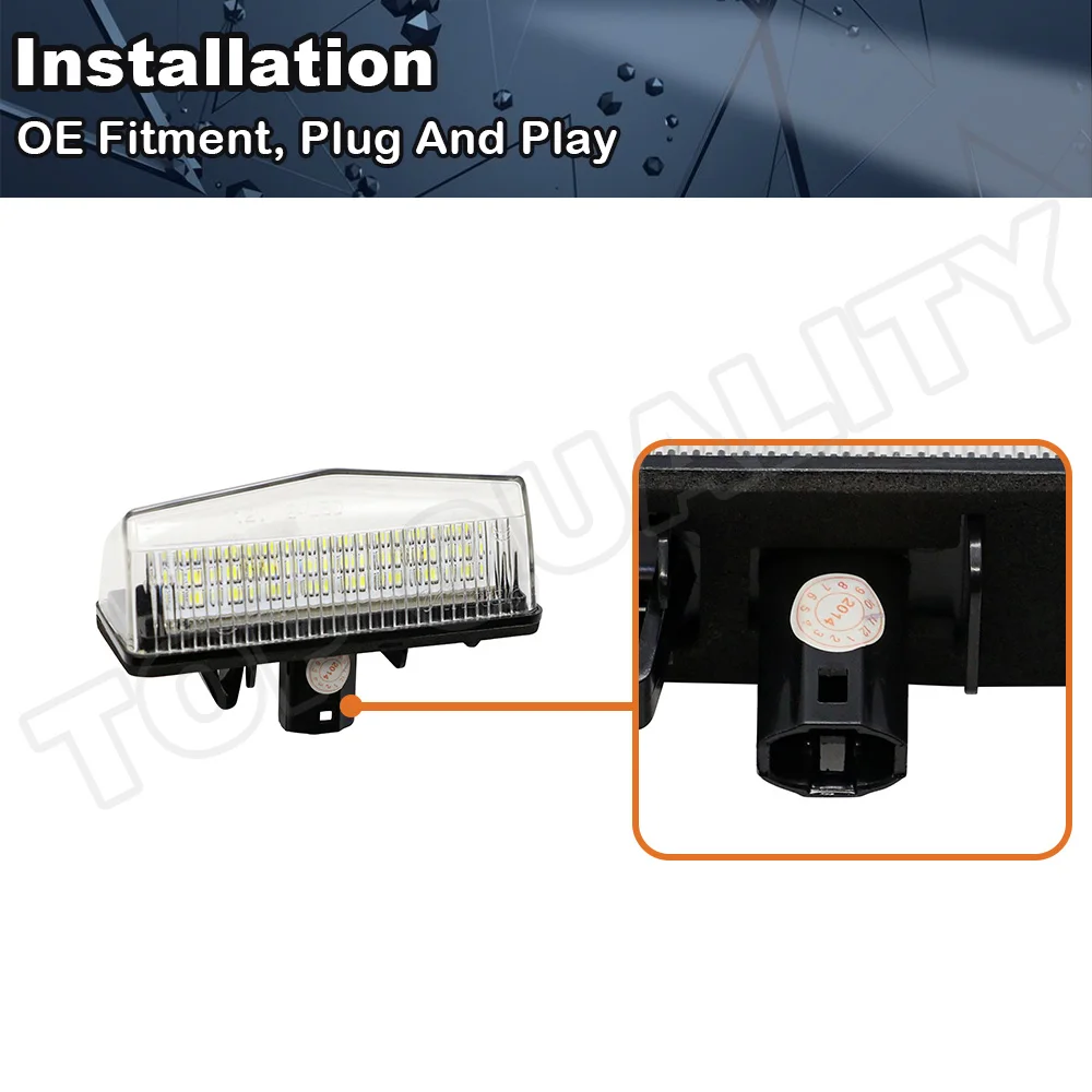 1. 2 шт. = 1 комплект светодиодный светильник номерного знака 2. Полный светодиодный светильник с прозрачными линзами в сборе. 3. Каждый светодиодный номерной знак светильник питается от наивысшей мощности белого цвета светодиодный диоды для подавления переходных скачков напряжения. 4. Улучшенная установка на OEM или других aftermarket номерных знаков. 5. Нет ошибок на приборной панели 6. В 5 раз ярче, чем галогенные лампы. 7. Значительно повышает безопасность и видимость во время езды ночью.