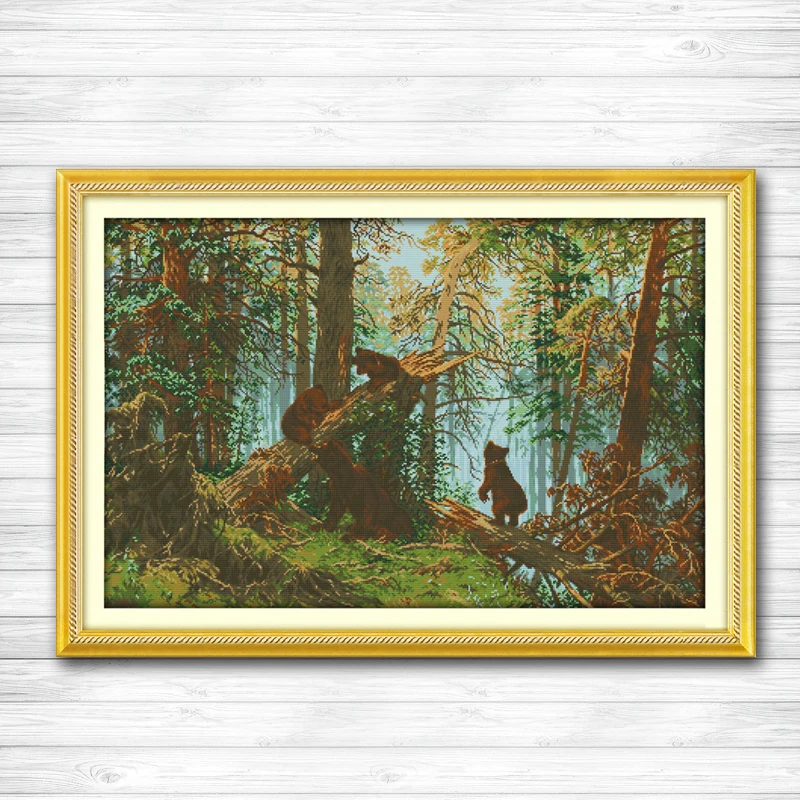 Мишки в сосновом лесу утренний пейзаж напечатанный на холсте DMC 11CT 14CT набор крестиков набор рукоделия Сделай Сам Вышивка
