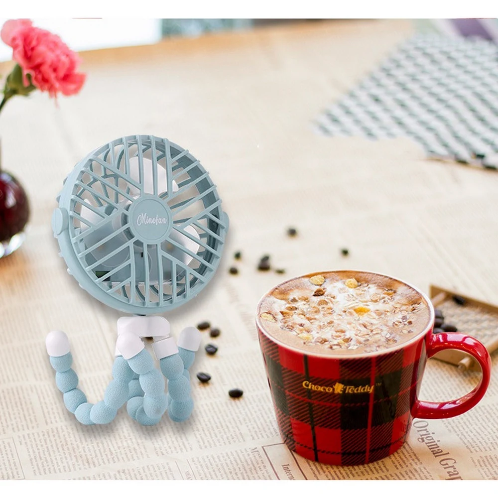 1. Flexible tripod: a small fan with a unique flexible tripod design. The tripod uses high-quality silicone and metal protective sleeves, you can bend any angle at will, grab, wrap, place, keep it durable, flexible and stable.
