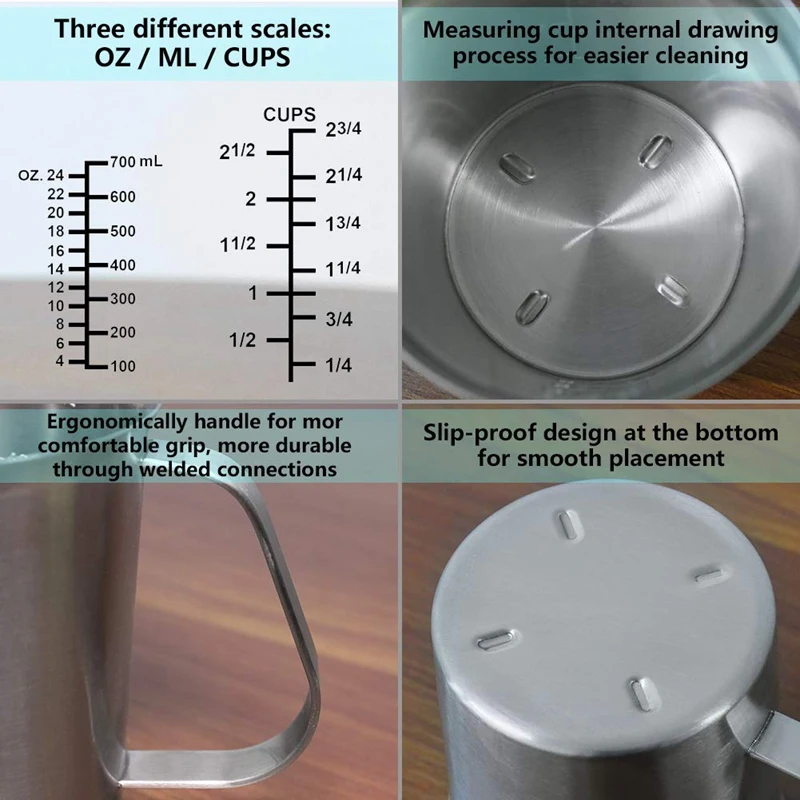 Внутри и снаружи прочные: изготовлены из нержавеющей стали, прочные и небьющиеся, прочные и прочные. Может превышать пластик и стекло. Не беспокойтесь о том, что он сломался, не упадя. Не используйте измерительные стаканы из нержавеющей стали, кислоты, соли и Другие коррозионные химические жидкости.