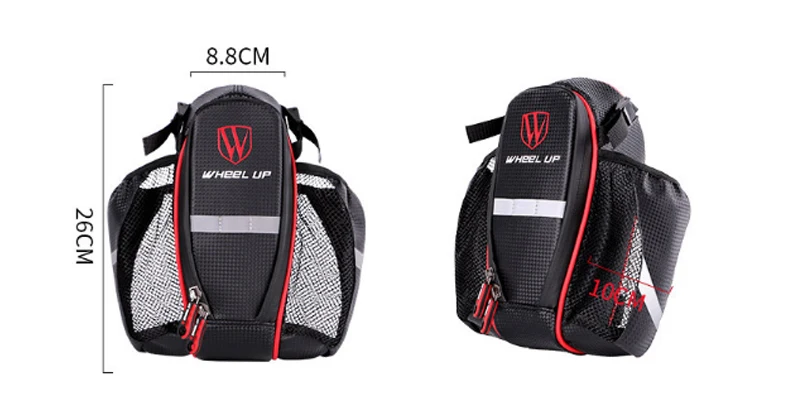 Характеристики: 100% новый и высокое качество 2 боковых кармана бутылки для воды Водонепроницаемая молния Внутренний чехол Светоотражающая лента Ткань: нейлон Цвет: черный и красный, черный и серый Вес: 220 г Размер: 26 см * 8,8 см * 7 см Посылка включает: 1 x MTB дорожный велосипед заднего хвоста сумка