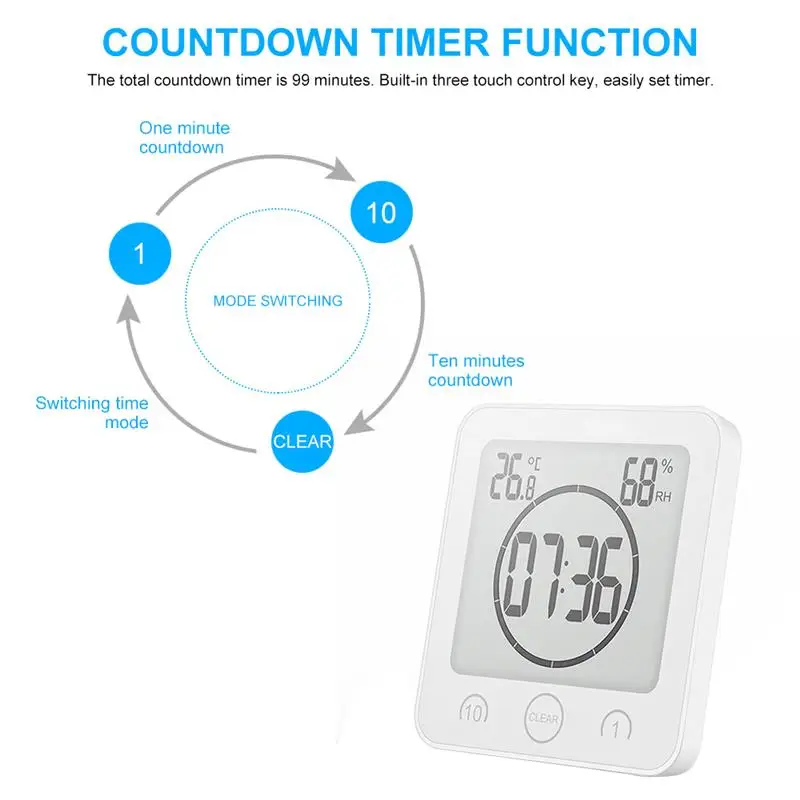 Общий таймер обратного отсчета составляет 99 минут. Встроенная три клавиши сенсорного управления, легко устанавливаемый таймер. При достижении установленного времени, четкий и громкий сигнал тревоги напомнит вам или близким людям. Подходит для душа, спа, отдыха, приготовления пищи.
