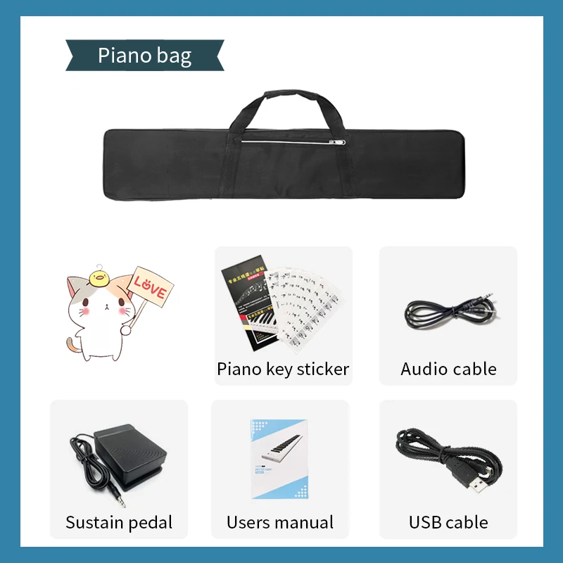 1 * электронная клавиатура 1 * USB кабель 1 * Адаптер питания 1 * педаль 1 * Руководство пользователя