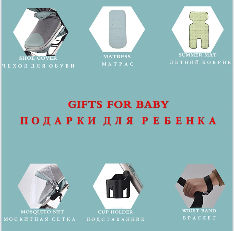 Gifts for baby, including mosquito net, footmuff, wrist band, cushion, summer mat, cup holder.