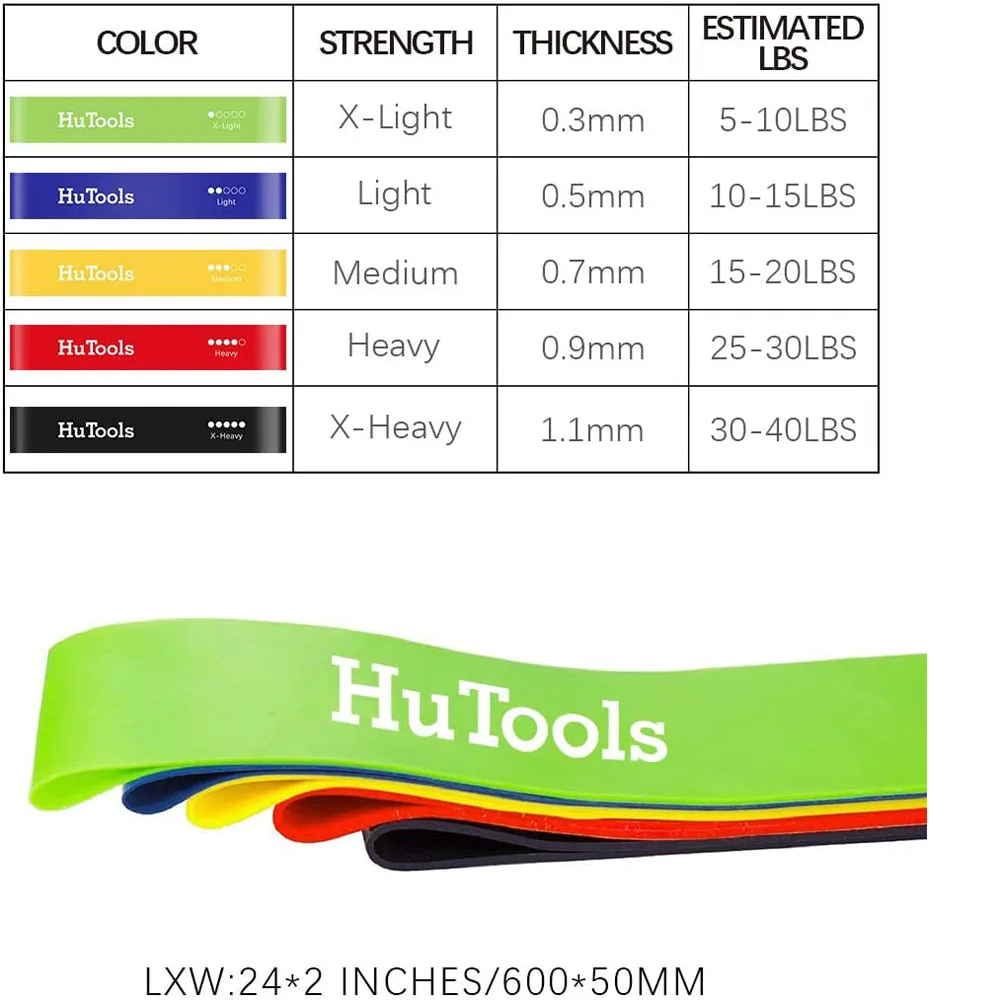 5 color coded bands for different stretch levels: Extra Light, Light, Medium, Heavy and Extra Heavy. With a length of 12" and width of 2" are easy to grip and to use.