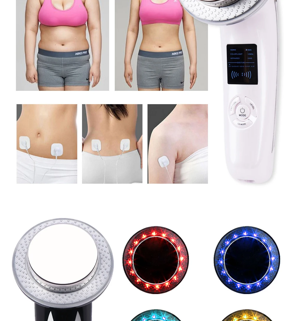 Характеристики:Тип товара: кавитационный ультразвуковой жирЦвет: белый, черныйВход: 100-220 ВВыход: 15 вЧастота: 1 МГцВилка: ЕС/США/Великобритания/АвстралияРазмеры: 8*20 см/3,15 * 7.87inОсобенности:1. Мини и стильный внешний вид, удобно носить с собой, прост в использовании.2. Эффективный ультразвуковой массажер для лица и тела.3. Уход за кожей, чтобы очистить, осветлить, сгладить внешний вид кожи.4. Глубокое очищение и увлажнение, уменьшает появление морщин и жировых отложений и укрепляет текстуру кожи.5. Это устройство принимает ультразвук 1 МГц и инфракрасную энергию для массажа и эффективного лечения кожи, а также для выполнения ультразвукового массажа для похудения, чтобы лепить контур тела, устранять лишний жир, тонизировать мышцы, стимулирует здоровую функцию тела через омоложение клеток и восстановление метаболизма тела.6. Этот инструмент может одновременно выполнять ультразвуковую, инфракрасную и микротоковую терапию кожи и тела.Функции:1. Красный светильник (640нм): проникающая кожа 1-6 мм. Для регенерации клеток кожи и снятия боли в аллергической коже2. Зеленый светильник (532nm): проникновении кожи 0,5-2 мм. Хорошая успокаивающим эффектом. Глубокий ремонт и отбеливание.3. Синий светильник (440нм): проникающая кожа 1 мм. Удаляет акне и подавляет воспаление4. Зеленый светильник (490нм): проникающая кожа 1 мм. Увеличивает энергию клеток, способствует метаболизму и улучшает качество кожи5. Фиолетовый светильник (430нм): проникающая кожа 1 мм. Светильник для очищения эритемы, удаления акне и восстановления кожи.6. Голубой светильник: улучшает энергию клеток и способствует метаболизму7. Соник: сжигание жира для похудения8.EMS: драга Меридиан9. Инфракрасный: способствует метаболизму и повышает иммунитет10. Вибрация: способствует поглощению11. Отрицательные ионы: очищают порыСоветы:Не забудьте сохранить вашу кожу увлажненной (гель для ухода за кожей рекомендуется, потому что они более проводящие)Посылка включает в себя:1 х основная машина2 пары EMS-прокладки1 х электродный шнур1 пара EMS перчаток1 x безопасные очки1 х адаптер1 х Руководство1 x Розничная коробка (опционально)