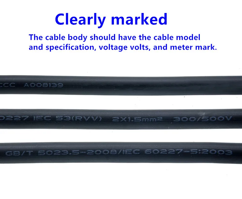 Корпус кабеля должен иметь модель кабеля и спецификацию, Напряжение Вольт и метровый знак.