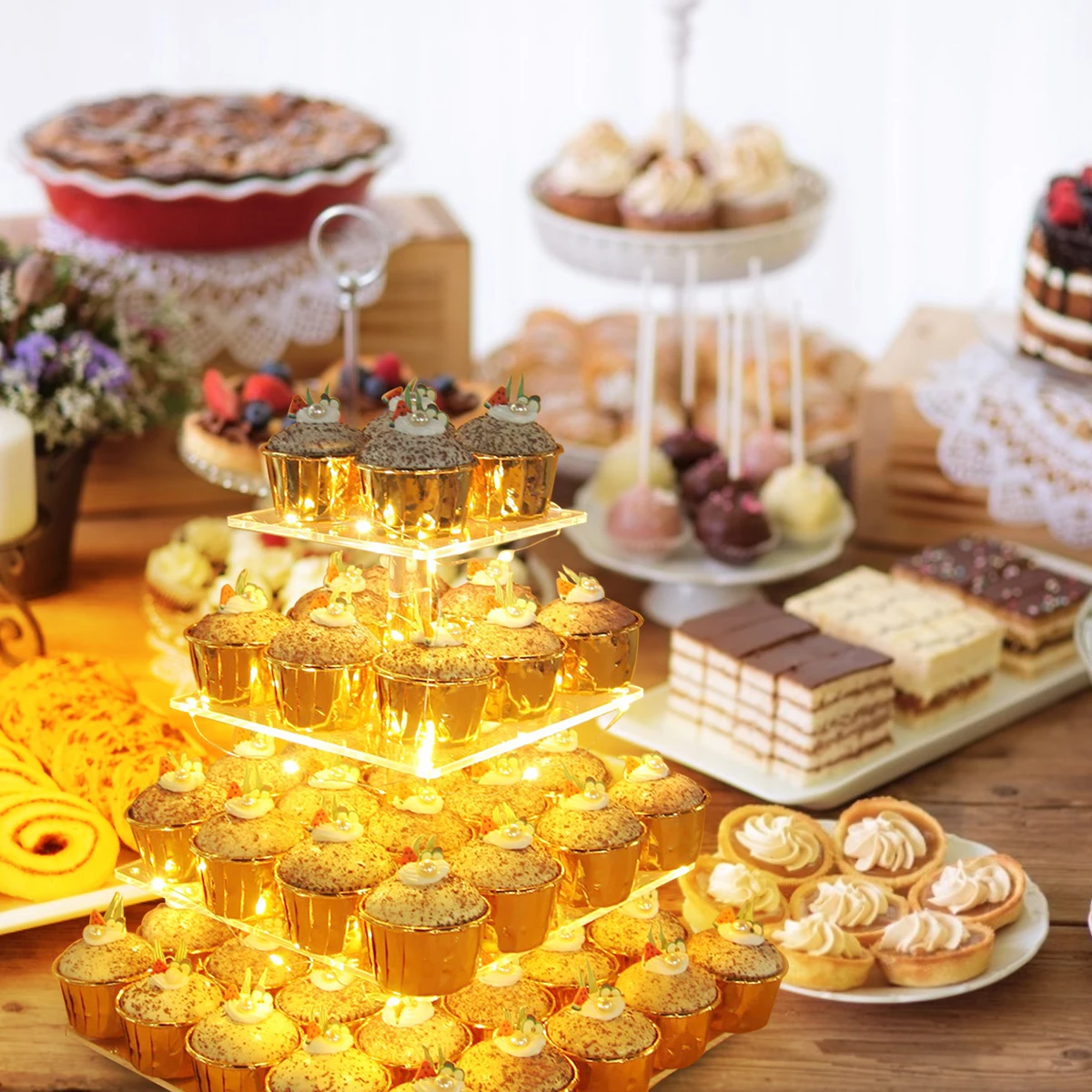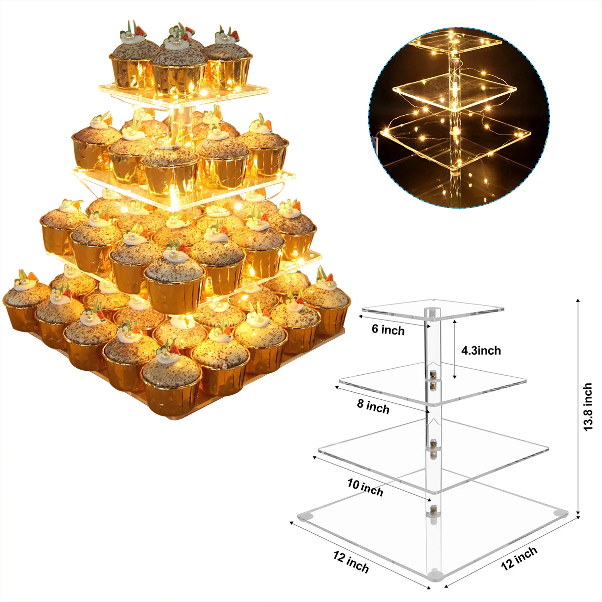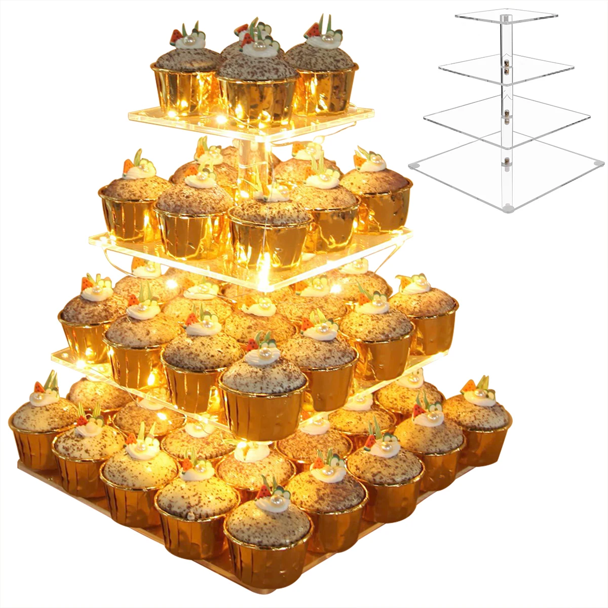 Квадратная подставка для кекса, 4 уровня, акриловый торт, десерт, дерево, башня, выставочный стенд, светодиодный светильник, на день рождения, свадьбу, вечеринку