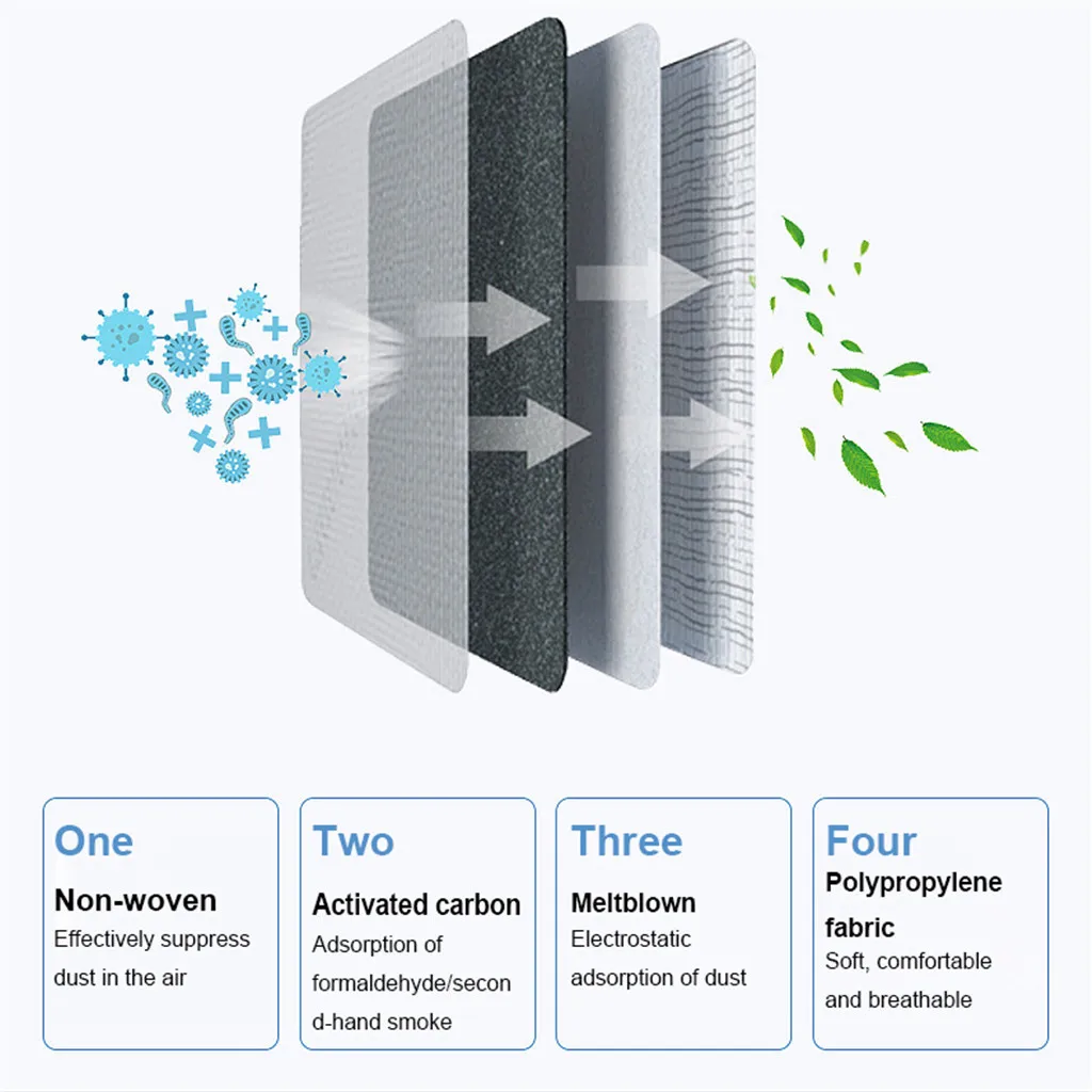 - 2 слоя нетканого полотна, 1 слой активированного угля, 1 слой расплава ткани, обеспечивает защиту от пыли, автомобильных выхлопных газов, пыльцы и т. Д.